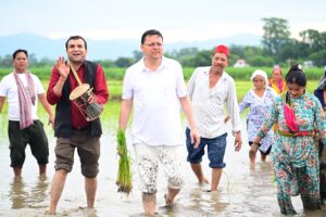 सीएम धामी ने हुडके की थाप पर खटीमा में की धान रोपाई किसानों के श्रम को किया नमन